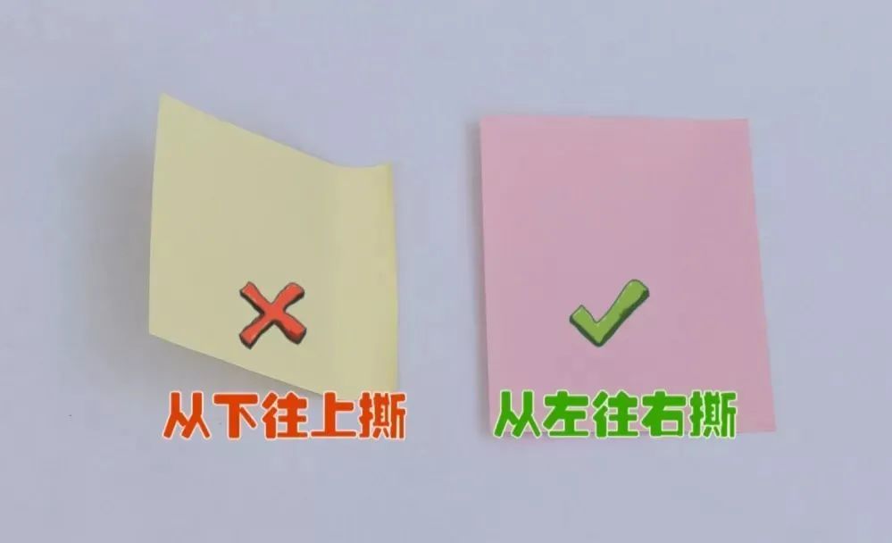 大部分同學(xué)撕便利貼都是從下到上撕,可是這樣撕下來的便利貼,往往容易翹起來。正確的撕法是從左到右撕,這樣的便利貼就不會(huì)翹起來了~